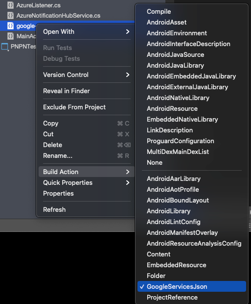 If this build action is not available, ensure that you've added the Xamarin.GooglePlayServices.Base NuGet packages listed above and restart Visual Studio.