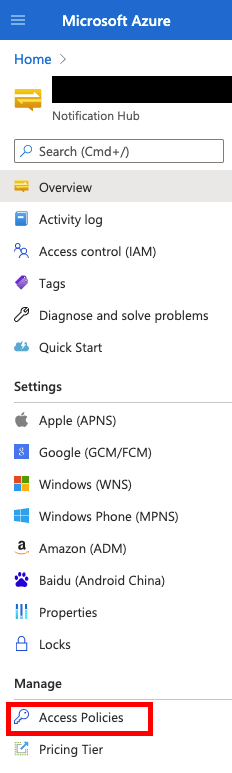 }You can find the required values for these constants in the Azure portal. Navigate to the notification hub that you've set up and select "Access Policies" under "Manage" on the left: