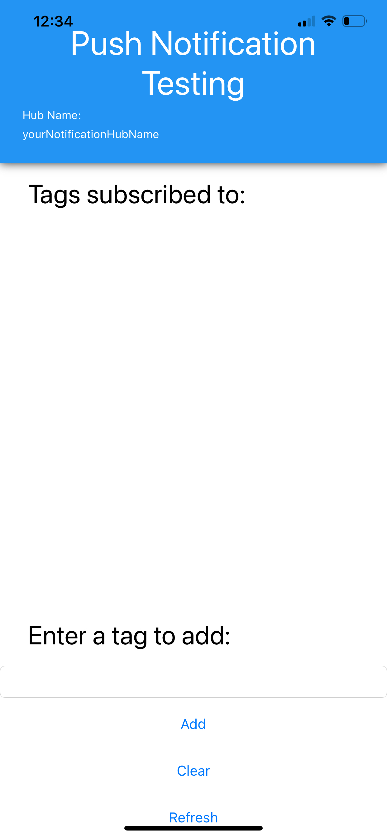 You can now use the app to subscribe to a tag. Add "weather" into the field where you can add a tag in the app and click "Add" - "weather" should then appear in the list of current tage. Now go back to the test send page in the Azure portal and enter "sport" in the tag field and hit send. You should see that the notification does not arrive in your app, and that the portal reports that there were no registrations to send it to. Now change the tag in the portal to "weather" and send again. You should now see this notification arrive in your app and get processed. Next, click the button to clear all tags from the app, and then send the same notification again from the portal. You should see that the notification does not arrive, and the portal reports there were no registrations to send it to You can repeat this test defining and using your own tags.