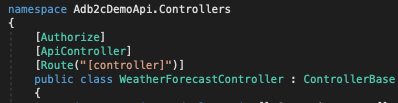 }That's it! You have now enabled AD B2C authentication in your Api. You'll see that we still have a commented out line in the Get method here: