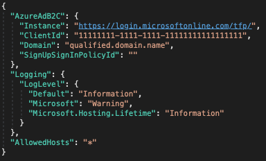 Now we'll turn our attention to the configuration details required to hook this up to our existing AD B2C tenant, which means opening appsettings.json.