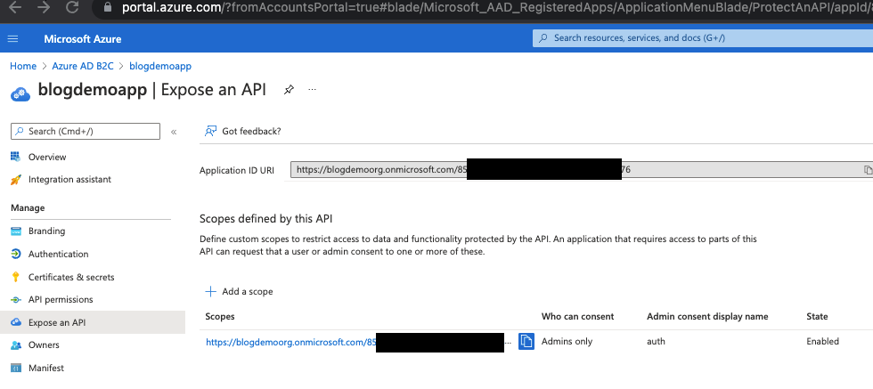 "Scope": "https://blogdemoorg.onmicrosoft.com/85xxxxxx-xxxx-xxxx-xxxx-xxxxxxxxxx76/auth",